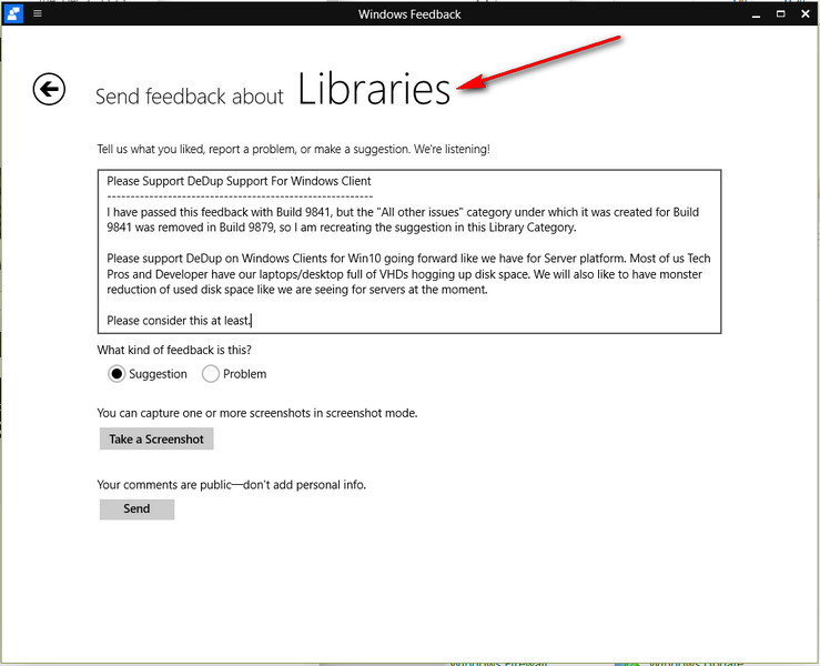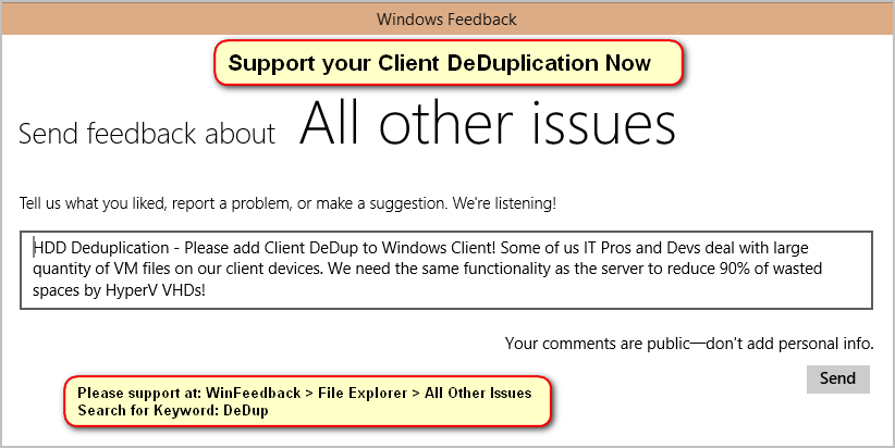Windows Feedback App > File Explorer > All Other Issues > Type Keyword: DeDup