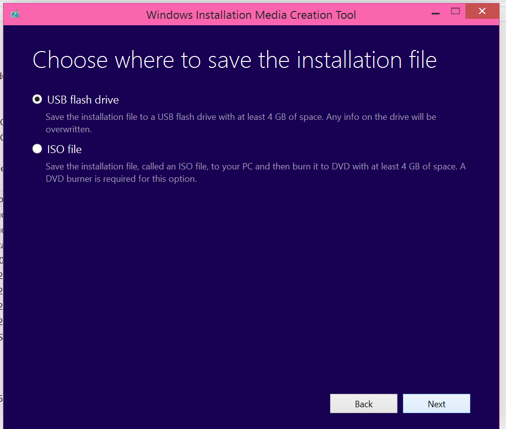 Step 4: You will be given the option to create a USB media or an ISO. To create an USB media, you will need to plug in a USB Key with at least 4GB of space on it. Warning: all files in the USB will be deleted. If you chose the ISO option, you will be given an image file of the OS which you can later burn to a DVD. You can also run the installer directly from the ISO without burning to a disk. I recommend choosing this option if you want to keep your media for later use. Once you selected an option, click next.
