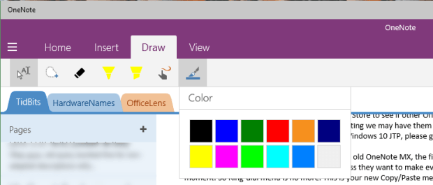 I have quickly peruse the changes compared the old OneNote MX, the first thing you notice, Ring-dail Menu is GONE! Sadly yes. I wish MS would retain that, but I guess they want to make everything compatible to how it is on iPad at the moment. So Ring-dial menu is no more. This is your new Copy/Paste menu when you right-click or touch-hold: