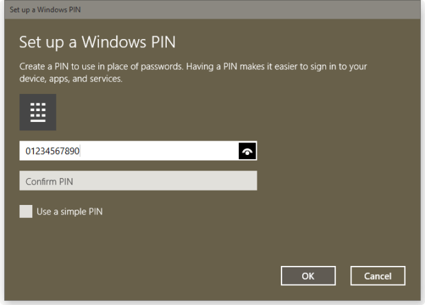 The problem with the ease of PIN is there also the higher risk of security. See, PIN is meant to be used when you’re alone at your desk and no one is looking over your shoulders. It quickly breaks down when someone is looking and you type 1234, easily remembered by shoulder-surfers. So some of us have been requesting that MS allow Extended PIN to contain longer PIN length for security reasons. Now we gladly inform that we now have the option to use extended PIN as you can see above. When you turn the “Use a simple PIN” flag OFF, you now have the opportunity to enter more than four number PIN as below: