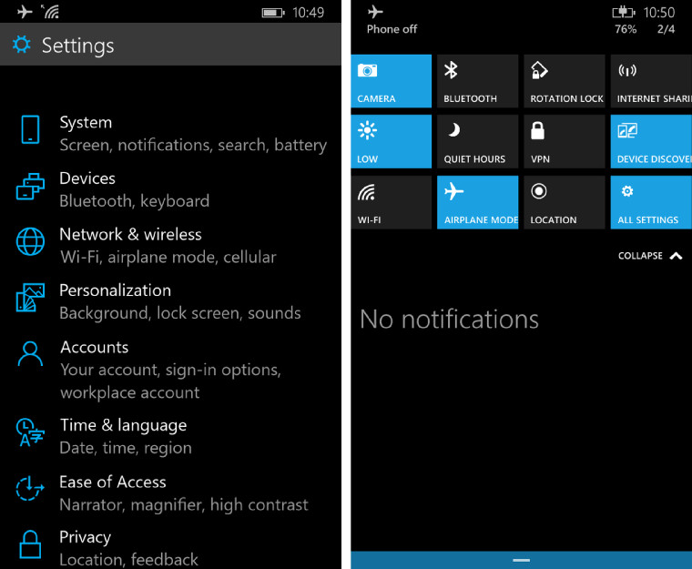 In the picture, which I embedded below, you can see the Universal settings app running on Windows 10 for phones. The settings app shares code with the PC/Tablet Windows counterpart. Notice that under the “devices” category, the description reads “Bluetooth, keyboard”. If my guess is correct, Windows 10 for phones will have external keyboard support!
