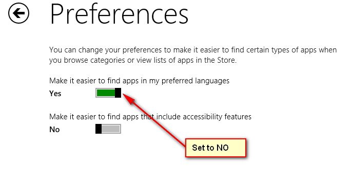 - Set “Make it easier to find apps in my preferred languages” to NO