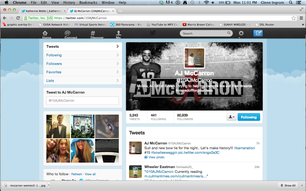 Previous Image Next Image Screen Shot 2013-01-07 at 11.01.28 PM AJ McCarron’s Twitter page as of 11:01PM with less followers than his girlfriend Sharing is a part of being humanTweet Email a link to a friend (Opens in new window) Email Like Loading...